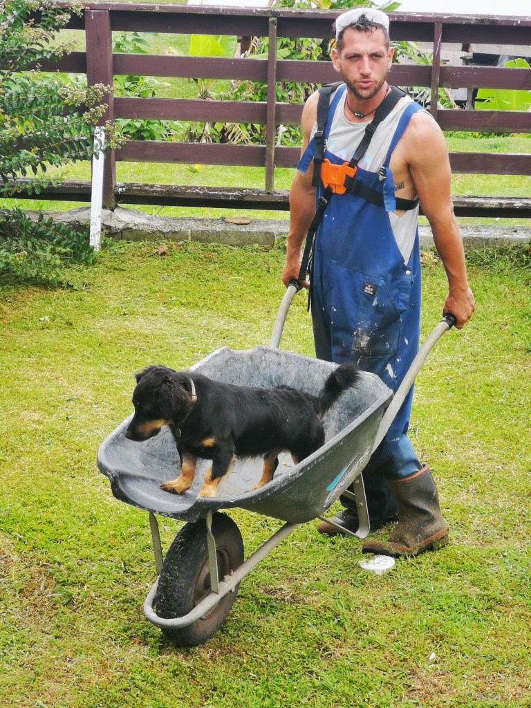 Vincenzo, called Vincè, is the newest member… and also the last to arrive. With his short little legs and little interest in walking, he’s not a fan of trails or reef explorations. So, with great dignity, he has self-appointed himself the official defender and guardian of the Ariimoana minivan. If you’re looking for him, you’ll surely find him sleeping soundly underneath, ready to protect his domain with one eye open and one closed.